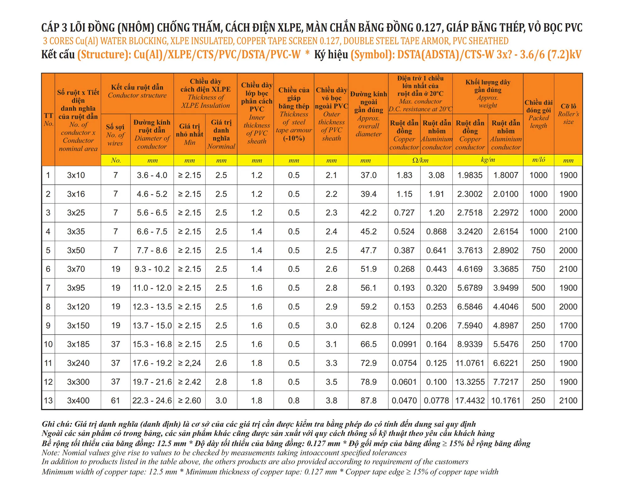 Cáp 3 lõi, màn chắn băng đồng, giáp băng thép - DSTA (ADSTA)/CTS-W 3x? - 3.6/6 (7.2)kV